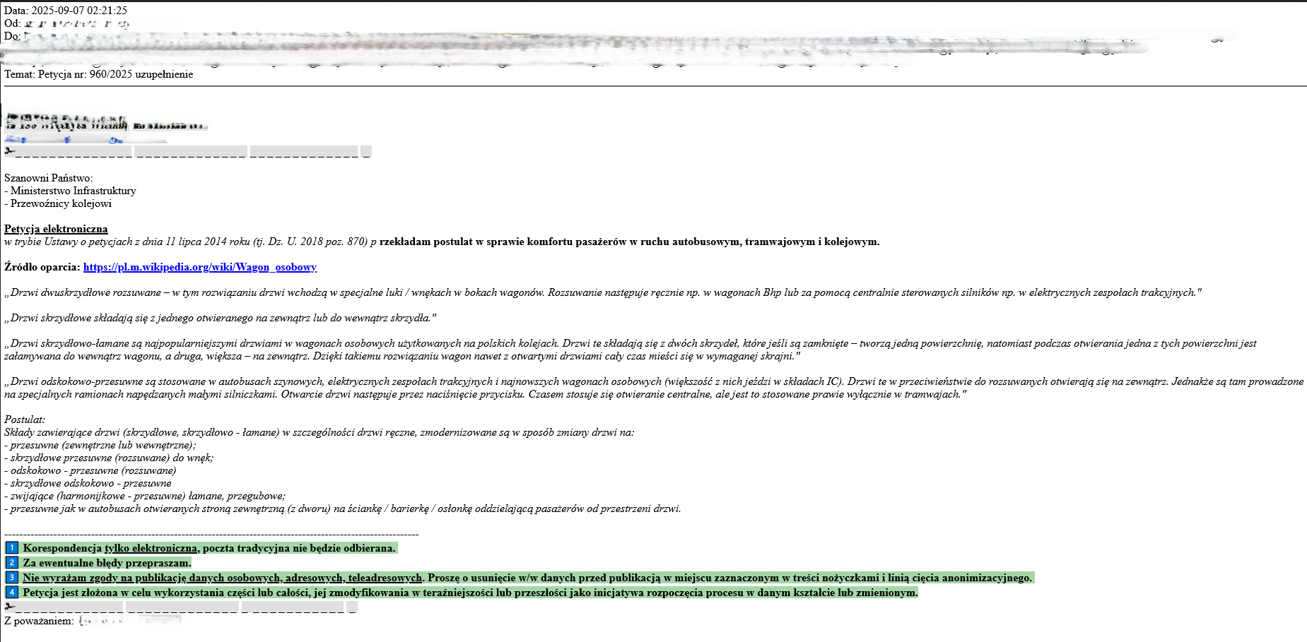 Petycja w sprawie sprawie komfortu pasażerów w ruchu autobusowym, tramwajowym i kolejowym